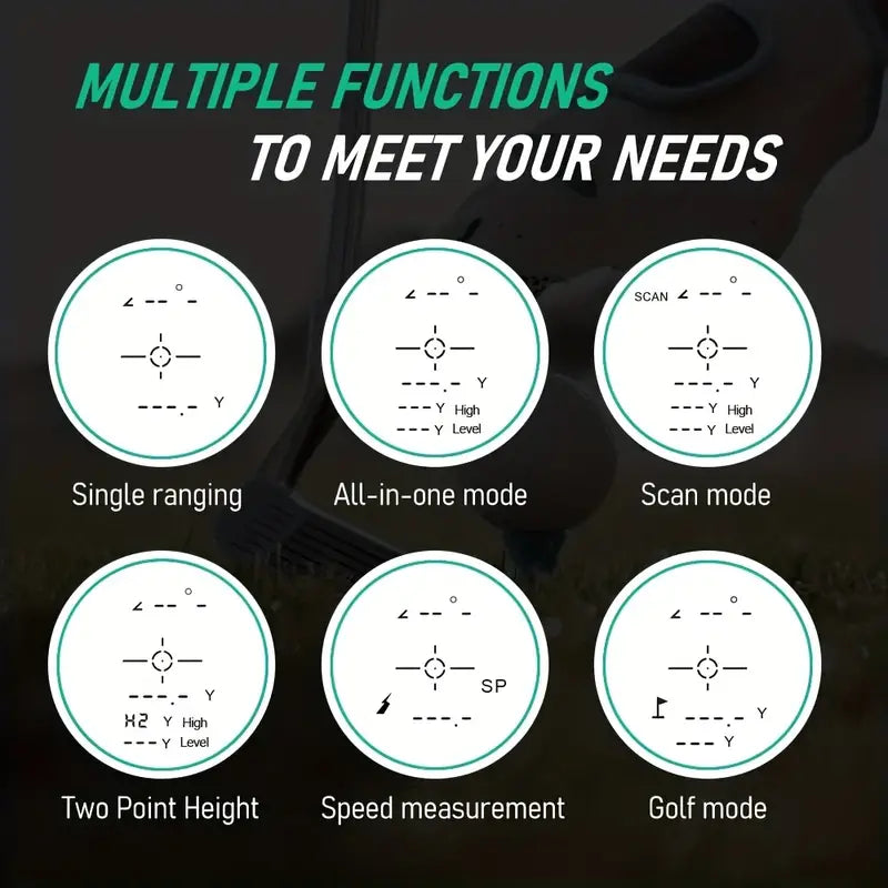 Beyond golf, this rangefinder offers a multitude of functions including straight-line distance measurement, all-in-one machine mode for angle/height/horizontal distance, scan mode, two-point height measurement mode, and speed measurement mode. Additionally, the golf trajectory compensation mode with slope compensation enhances your gameplay by adjusting for elevation changes.